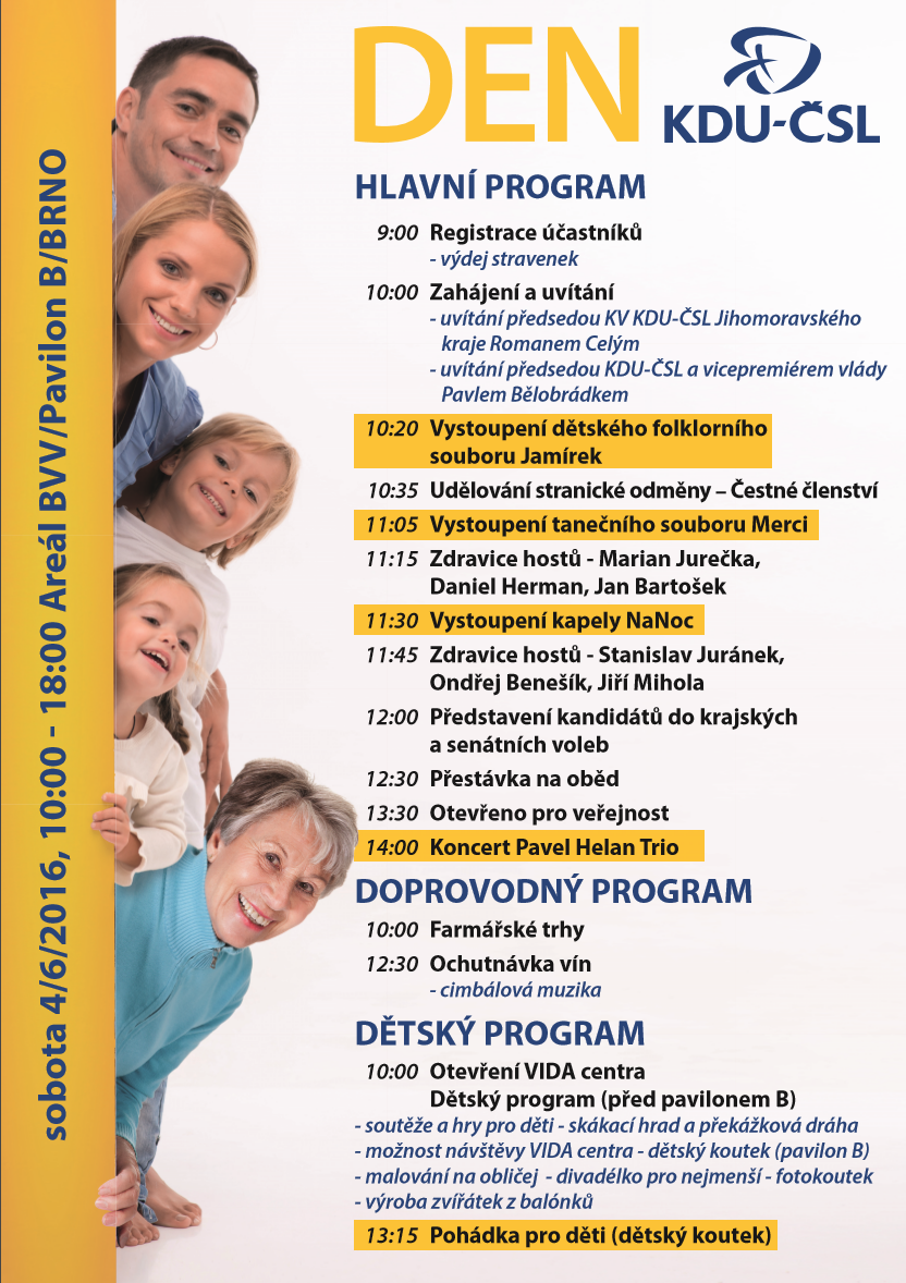Stejně jako před dvěma lety v Jihlavě, najdete i na brněnském výstavišti řadu zajímavostí. Tou největší bude koncert vlídného zpěváka a skladatele, který vystoupí ve formaci Pavel Helan Trio. Očekáváme příjezd významných osobností z řad lidové strany, s nimiž bude prostor si popovídat a vyměnit názory. V rámci dopoledního bloku budou oceněni významní členové strany.